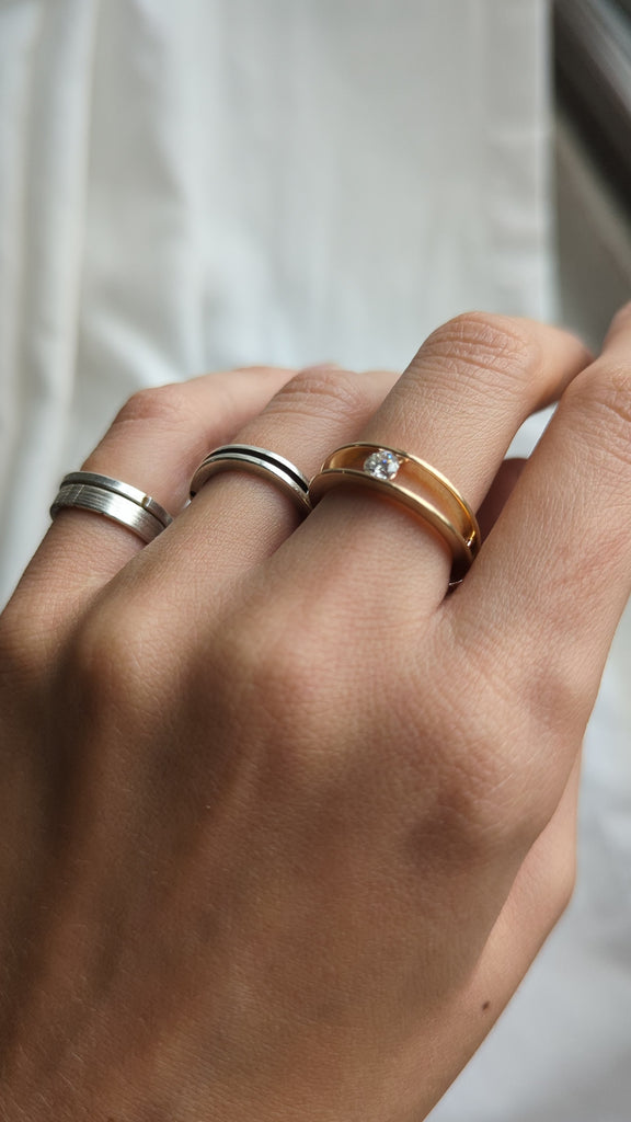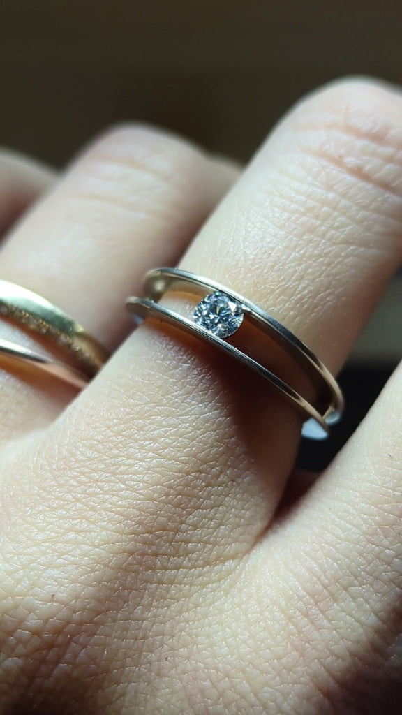 The OBsess Ring is a combination of traditional diamond aesthetics and modern "aka jewellery" style. Two thin metal discs securely hold the diamond in an illusion of suspension.